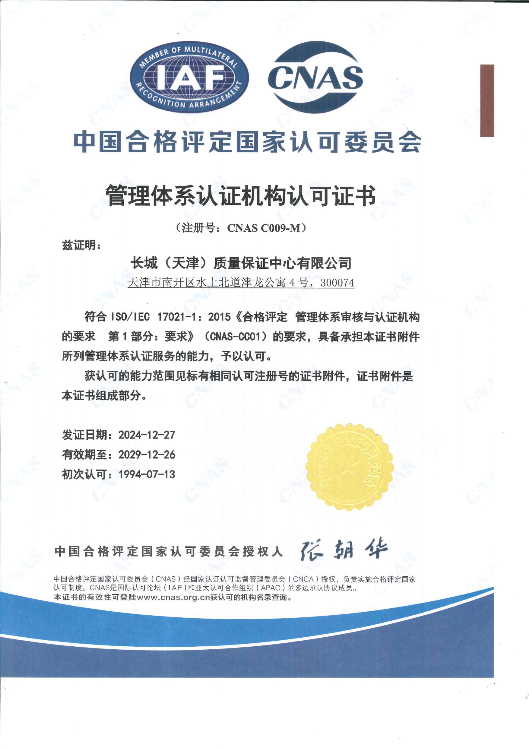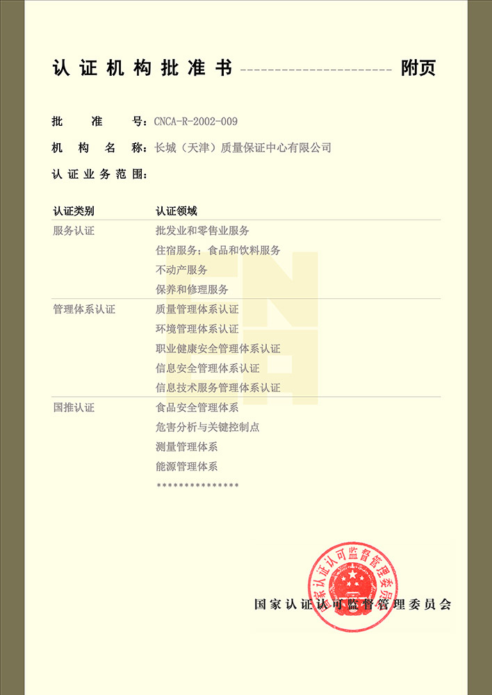 • 長城中心管理體系認證機構認可證書 中文